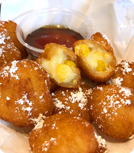 Fresh Cut Fries Small 3.00 Large 5.75 Dipping Sauce .75¢ Onion Rings 7.50 Fresh Cut Onions dipped in our House Beer Batter, fried to golden perfection, served with our own Kickin’ Dippin’ Sauce! Crusted Cheesy Balls 6.50 Our Homemade, Five-Cheese Cheese & Mac rolled into balls, covered with Panko and fried to a golden brown. Try with our famous pizza sauce for dipping! Bread Sticks 6.00 Our homemade dough baked till golden brown, brushed with Garlic Butter or Plain, Add fresh grated parmesan for .50¢ Corn Nibblers Lg (20) 6.95 Sm (10) 3.50 Mini corn fritters with syrup and powdered sugar Cheese & Mac 4.95 Homemade with Five different Cheese, baked and super cheesy! Chicken Tenders (4) 5.50 (8) 10.95 Choice of BBQ, Ranch or Honey Mustard Sauces Kids Tenders & Fries (2) 5.50 Fresh Corn, Deep Fried Seasonal One Ear 1.99 3 Ears 5.75